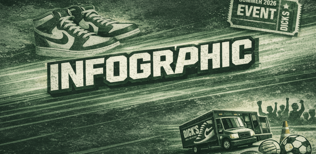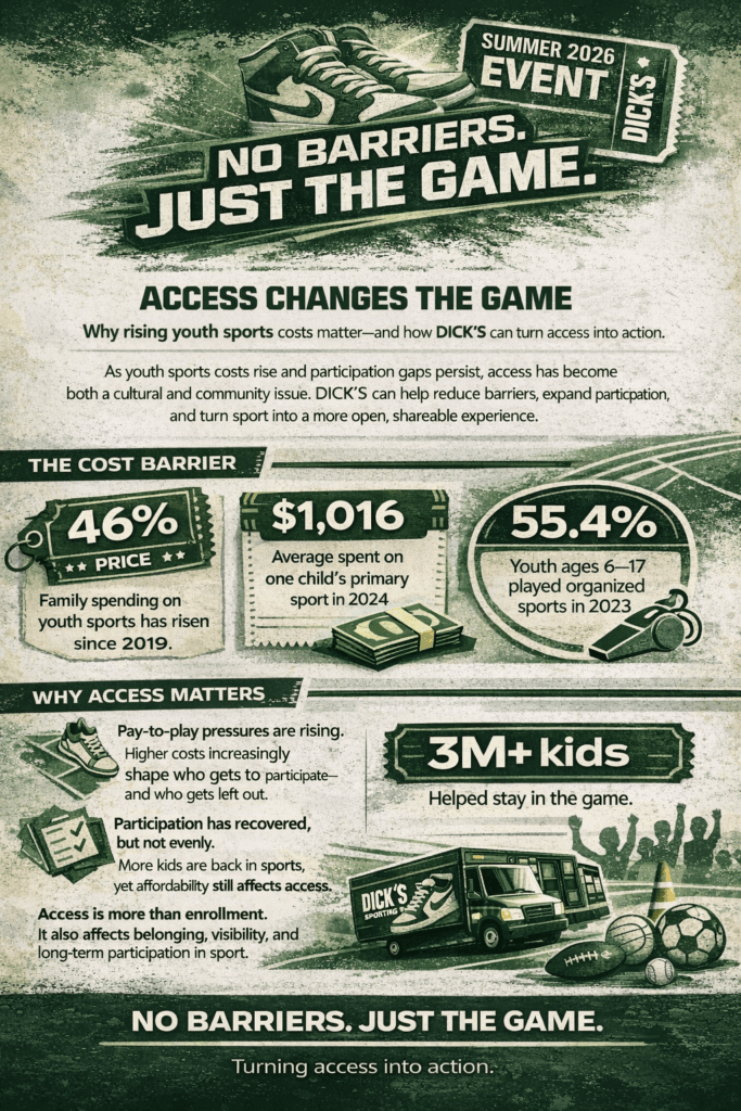 This infographic is designed to show that youth sports access is increasingly shaped by cost, and to position DICK’S Sporting Goods as a brand that recognizes and responds to that barrier. It begins with statistics on rising family spending and participation in organized sports to establish the scale and relevance of the issue, then connects those realities to DICK’S own commitment to supporting young athletes. By doing so, the messaging moves beyond product promotion and instead reinforces the campaign’s core idea, “No Barriers. Just the Game.” Strategically, this aligns with the brand by linking DICK’S identity in sport, community, and youth participation with a broader public issue: access. Altogether, the infographic helps frame DICK’S not simply as a retailer, but as a credible advocate for inclusion, opportunity, and long-term participation in sport.
